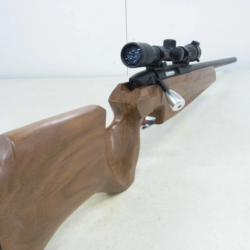 加えてアジャスタブルトリガーを備え、トリガープルの細かな調整が可能。外装面では剛性の高い木製ストックを採用し、射撃時のブレを抑制。競技射撃に求められる再現性と安定性に特化した構成です。