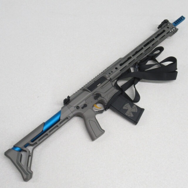 このモデルはアルミ製上下レシーバーとフリーフロートハンドガードにより、剛性の高い基本骨格を持ちます。アクセントとなるブルーのストックパイプやマズル周りのデザインも特徴的で、AR系カスタムの中でも個性的なルックスです。