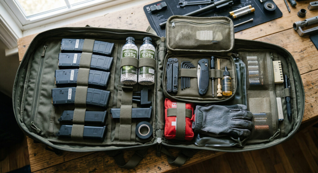 サイドポーチや内外の仕切りを活用することで、BB弾や工具などを取り出しやすく分けて収納できる構造が望ましいとされています。