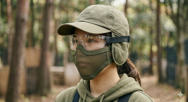 フェイスガードは口元と頬をカバーし、耳まで覆うタイプなら横からの被弾にも対応できます。